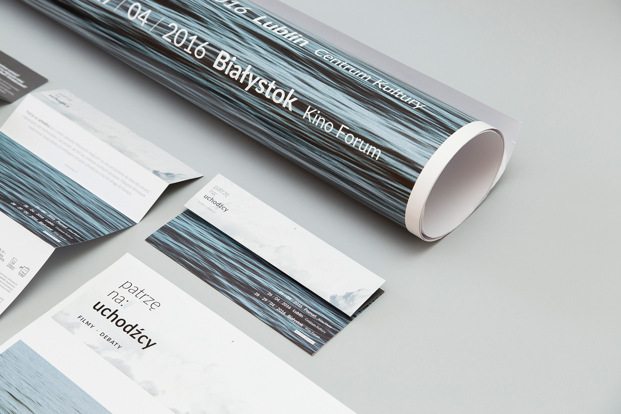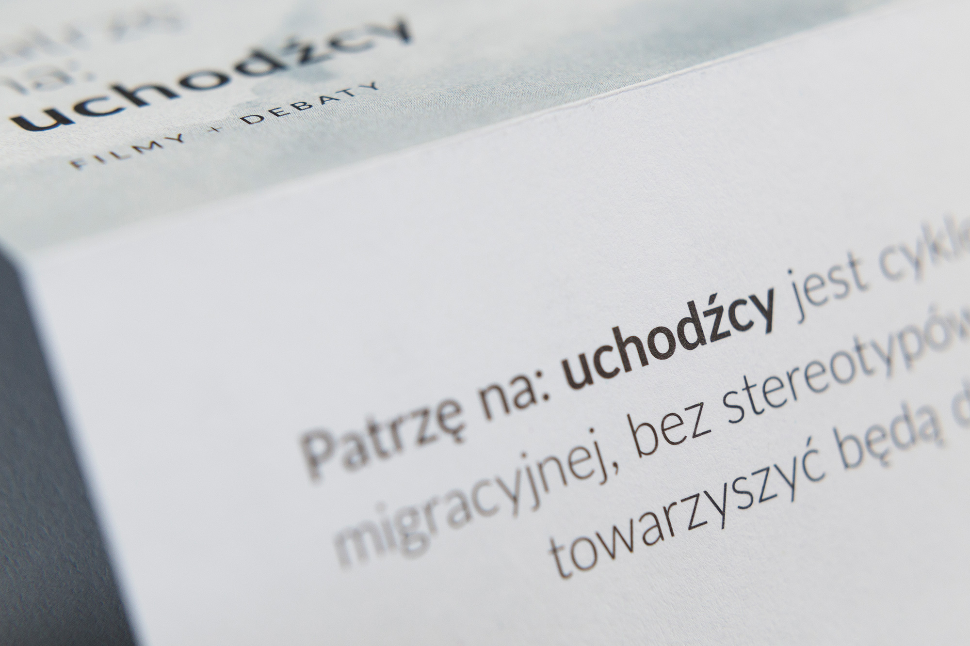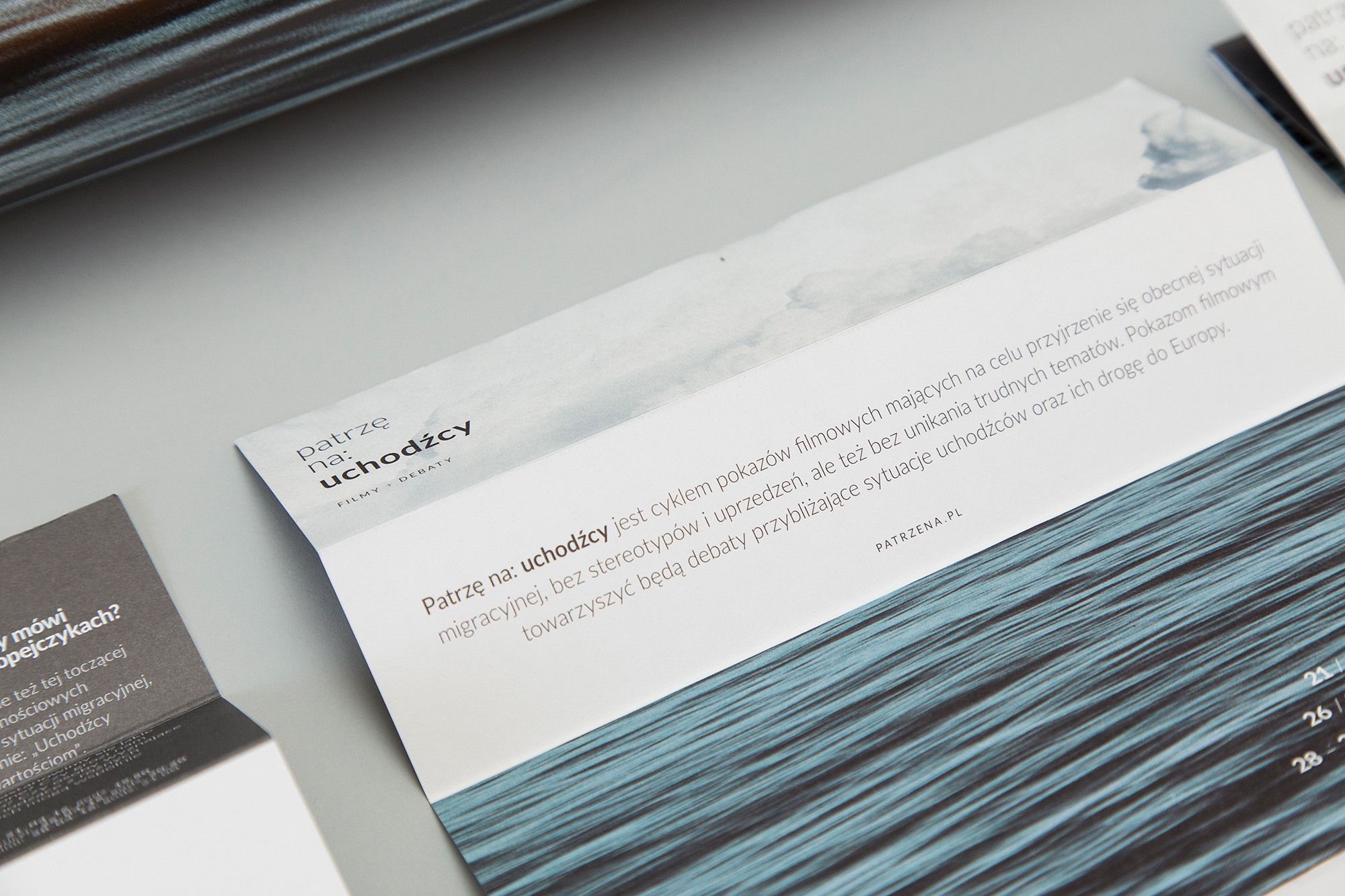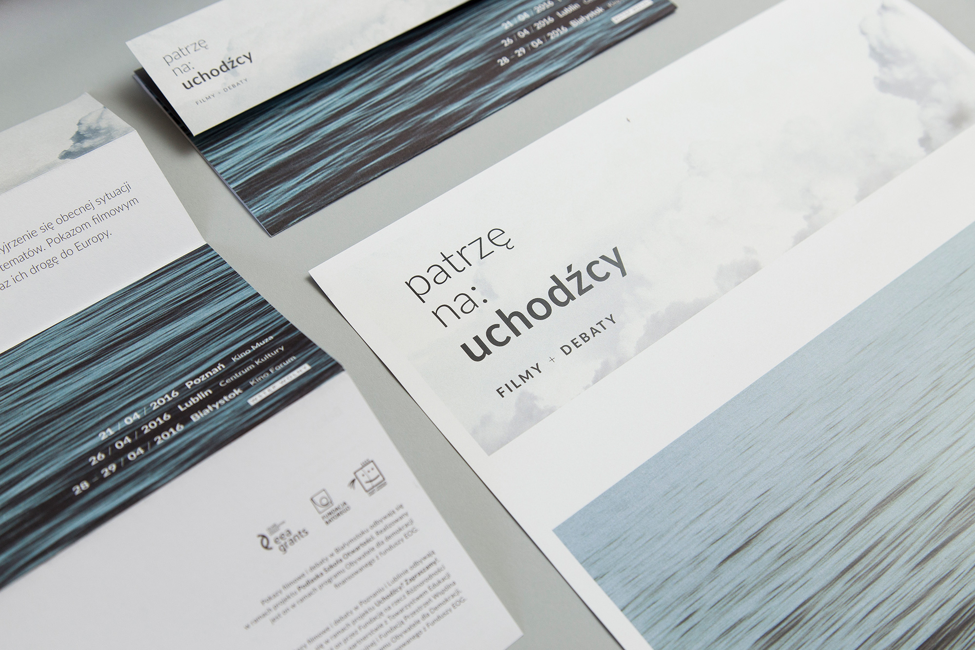 “Patrzę na” means “I’m looking at”. “Uchodźcy” means “Refugees”. Most refugees come to Europe by sea. They try to find a safe haven or maybe a paradise. Because the road is long (geographically and bureaucratically) the sea is divided from the clouds with a wide white stripe of uncertainty. And the clouds of the “paradise” can as well be storm clouds.